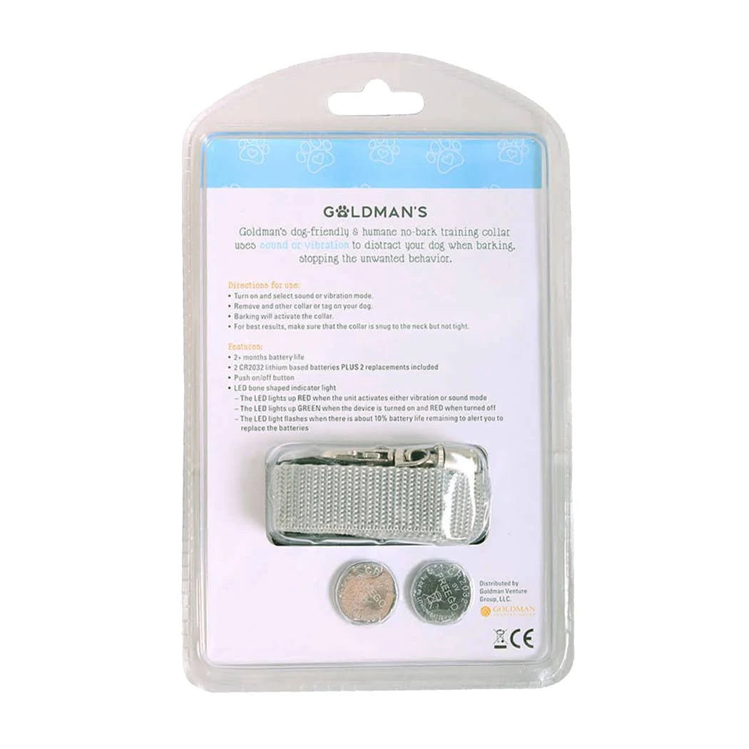 Goldmans dog-friendly & humane no-bark training collar uses sound or vibration to distract your dog when barking; stopping unwanted behavior.
